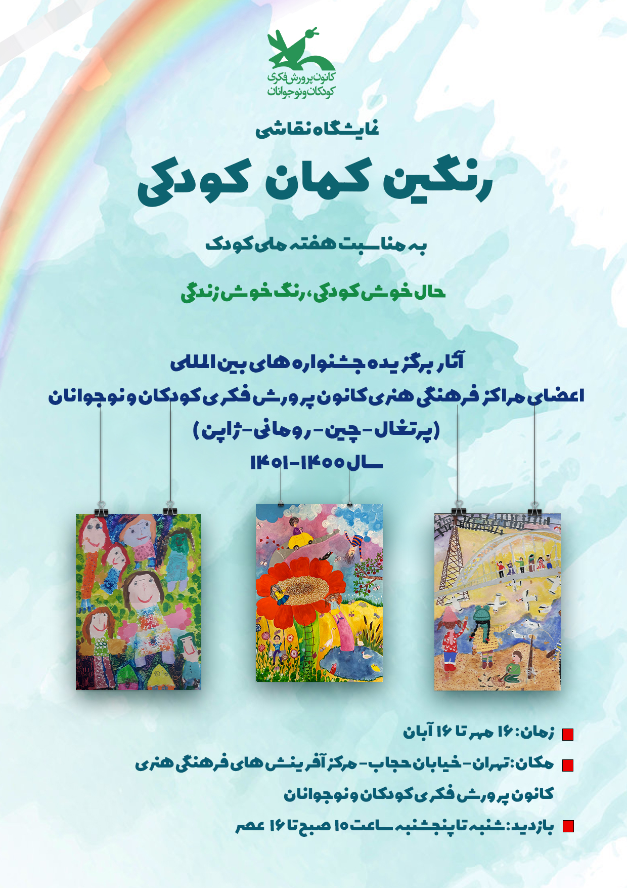 در نمایشگاه نقاشی «رنگین کمان کودکی» که همزمان با هفته ملی کودک برگزار میشود، ۱۴۳ اثر برگزیده از اعضای مراکز کانون سراسر کشور در ۸ فراخوان بینالمللی از کشورهای پرتغال، چین، رومانی و ژاپن در سال ۲۰۲۱ (۱۴۰۰–۱۴۰۱) به نمایش درآمده است. این فراخوانها شامل مسابقههای محیط زیست، هنرهای تجسمی و نقاشی کودکان با موضوعاتی چون زمین در سال ۲۰۳۰، سفر، خواب، سلامتی و دوستی، شهر و محل زندگی، شخصیت فردی و حفاظت محیط زیست بوده است که نشاندهنده تنوع موضوعات و خلاقیت کودکان ایرانی در سطح بینالمللی است.
